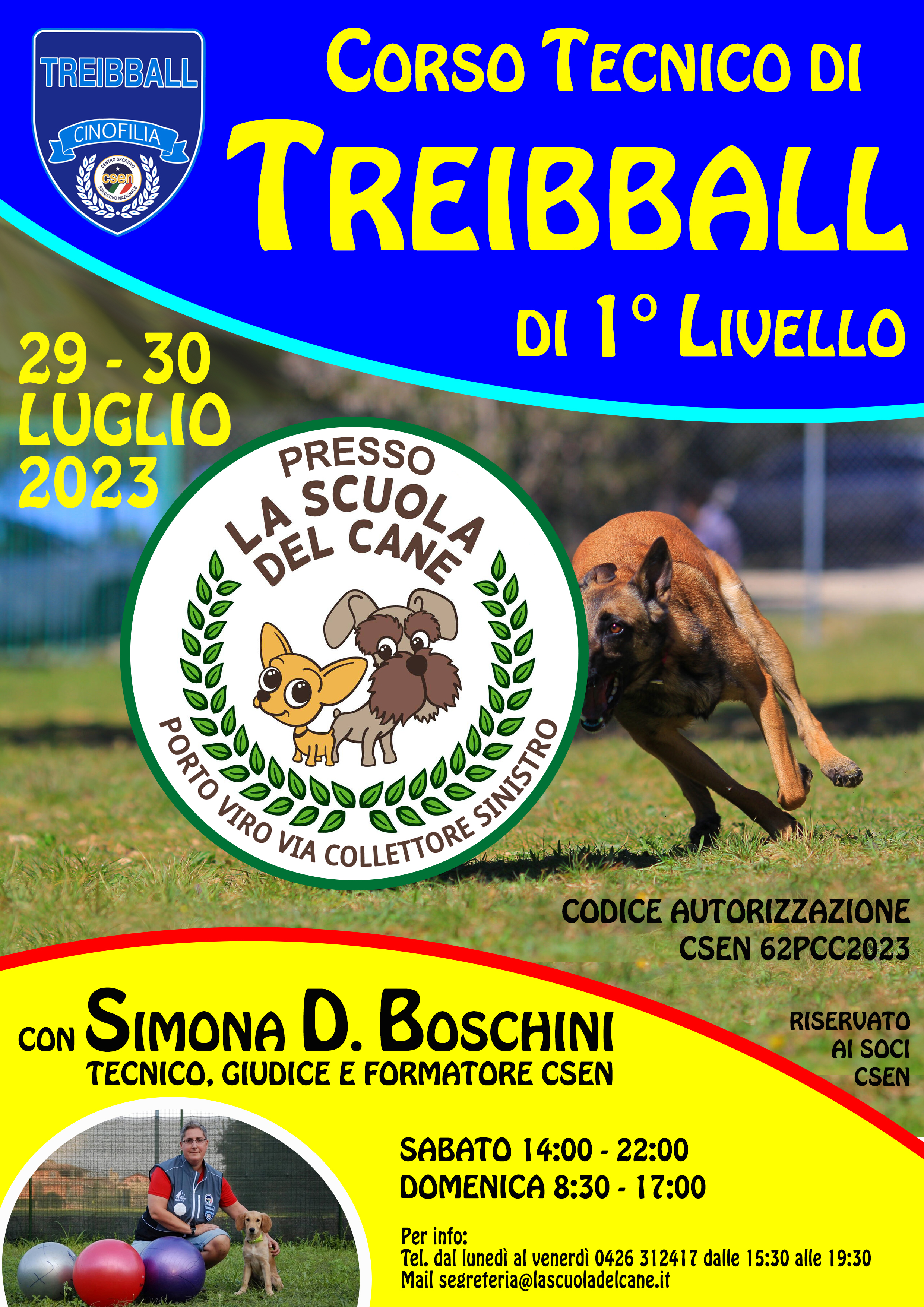 Il corso Tecnico di Treibball di 1 livello si svolgerà nei giorni 29 e 30 luglio 2023 presso l'ASD LA SCUOLA DEL CANE a Porto Viro, via Collettore sinistro. Il corso avrà come Tecnico Formatore CSEN Simona D. Boschini.