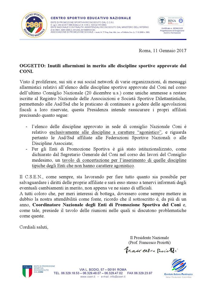 Molte associazioni e società che svolgono le attività non inserite nell'elenco in quanto non considerate “sportive” si sono subito allarmate. Premettendo che è auspicabile, quanto prima,  che il massimo organo sportivo puntualizzi e chiarisca  i contenuti della delibera, si è espresso sull'argomento al fine di evitare inutili allarmismi il Presidente Nazionale CSEN, nonchè Coordinatore Nazionale degli Enti di Promozione Sportiva del CONI, Francesco Proietti.
