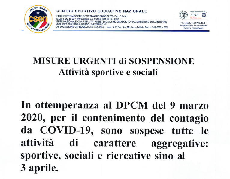 La segreteria CSEN Veneto rimane operativa dalle 9.30 alle 12.30, ma chiusa al pubblico: 0497800826 - segreteria@csenveneto.it.